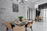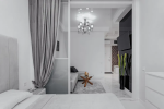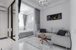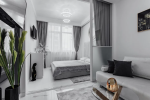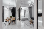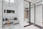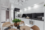 Спальня + кухня-столовая со встроенной техникой и мебелью и гостиная.