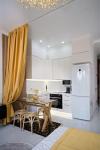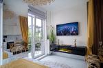 . Весь комплекс состоит из малоэтажных домов , с круглосуточной охраной , подземным паркингом. Детская площадка , зона барбекю, многочисленные зоны отдыха. Квартира находится на 4 этаже , вид из панорамных окон и балкона в красивый двор с фонтаном. Квартира с авторским ремонтом и дизайном . Студия имеет зону столовой , гостиной и спальни. Изысканный интерьер , множество зеркальных элементов , которые предают легкость и простор. Большой телевизор . Камин - который сделает ваши вечера незабываемо уютными и романтичными. Полностью меблирована и оснащена бытовой техникой.