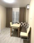 Декор квартиры выполнен в светлых теплых тонах. На кухне мягкий угол.