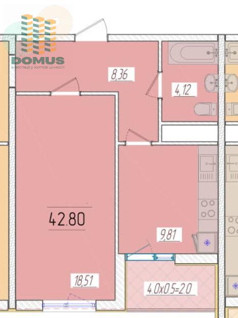 Общая площадь: 42,8 м2