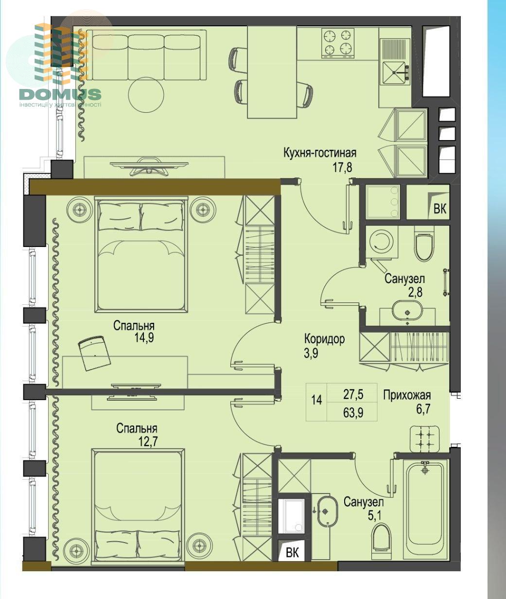 Общая площадь: 63,9 м2