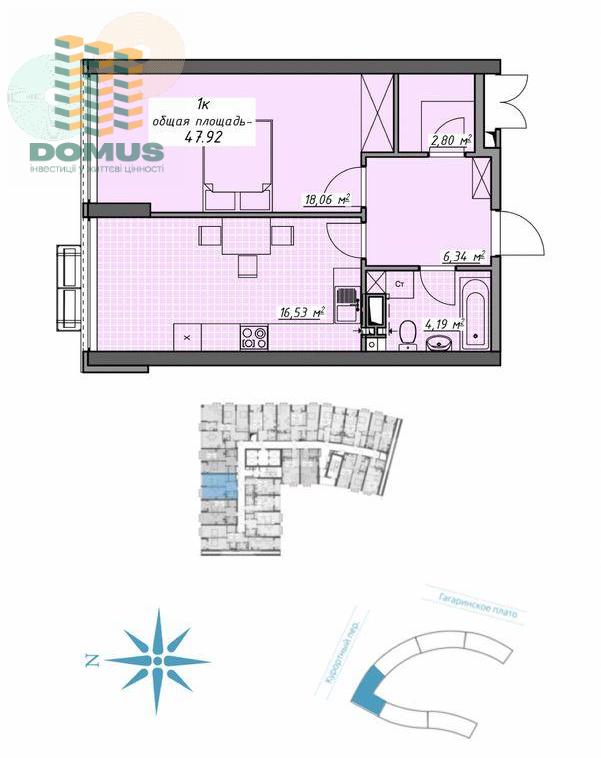 В продаже 1-комнатная квартира площадью 48м2, в ЖК " Атмосфера ", ул. Курортный пер. 2.