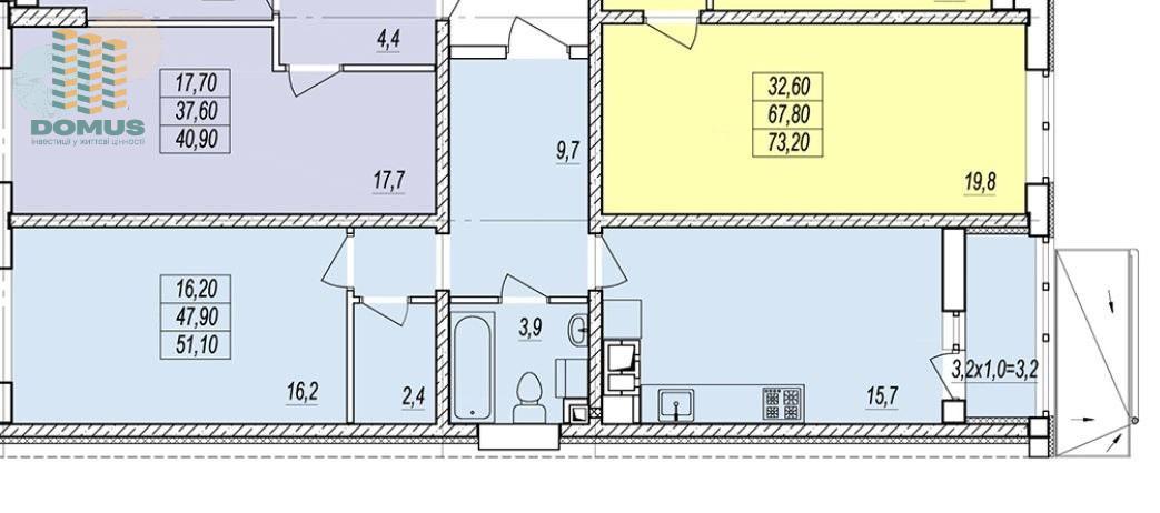 Общая площадь: 51,7 м2