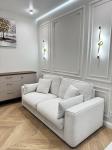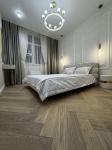 Интерьер выполнен в изысканном стиле французской классики: благородная цветовая палитра, элегантные линии и внимание к каждой детали. В отделке использованы инженерная доска, система тёплого пола, межкомнатные двери из массива натурального дерева.