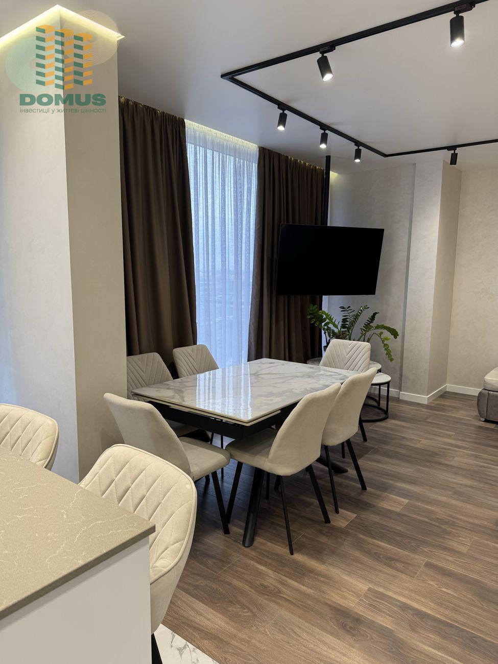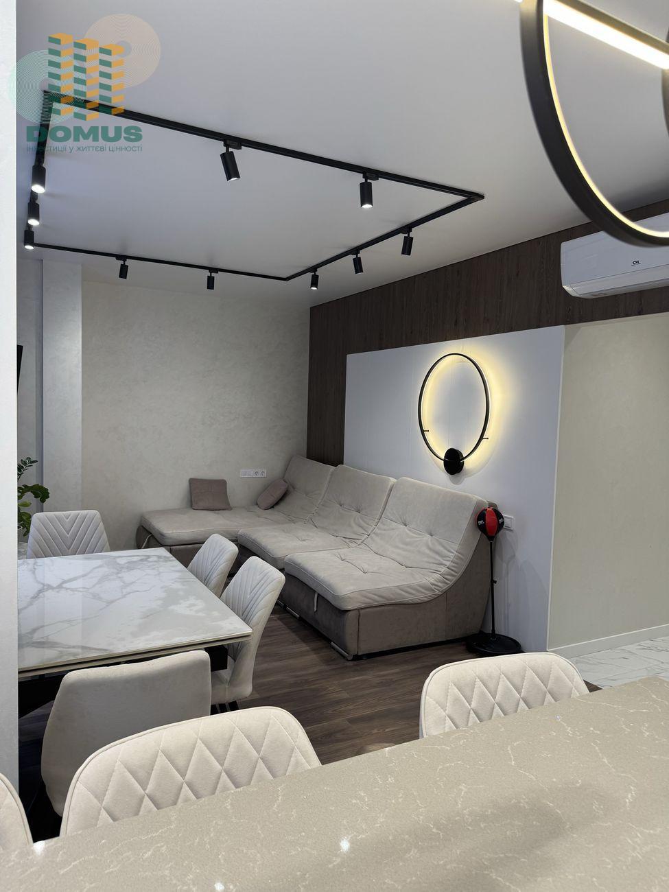 Кухня-гостиная площадью 30 м2. В квартире выполнен дизайнерский ремонт в современном стиле. Вся мебель изготовлена под заказ из качественных и долговечных материалов